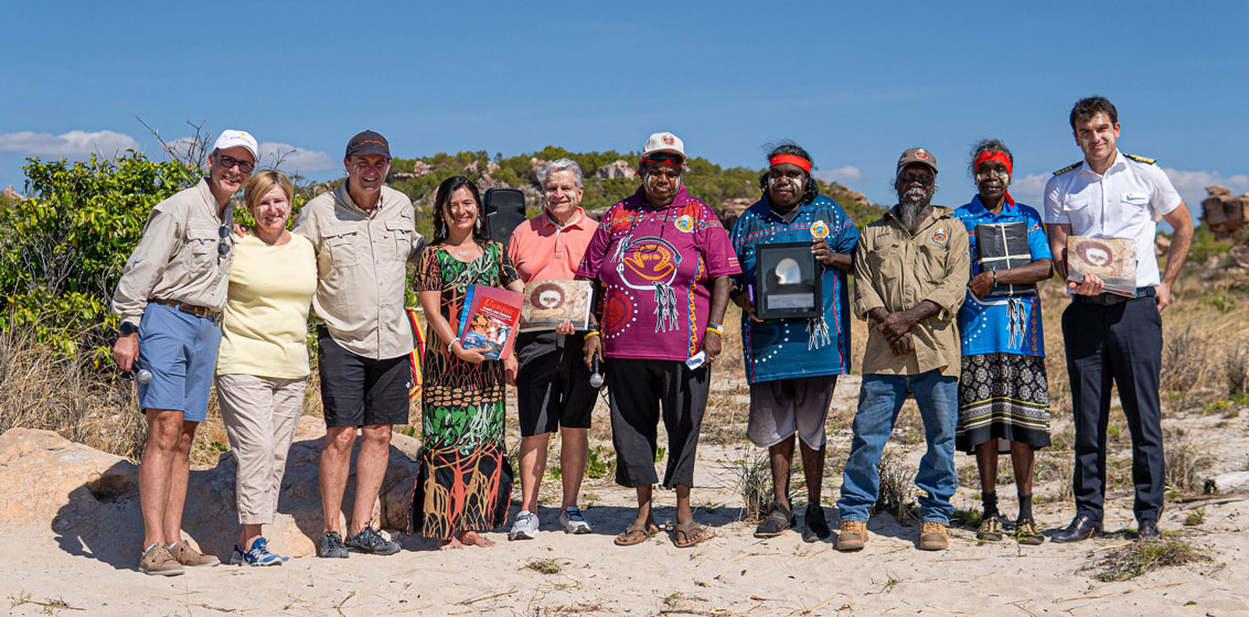 Seabourn and Wunambal Gaambera Traditional Owners exchanged gifts to celebrate their new relationship. In addition, Seabourn guests Vince and Jane Roig, who have sailed on every Seabourn inaugural voyage on the current seven-ship fleet, presented the Traditional Owners with a symbolic gift of art supplies as a token of appreciation for this new partnership together.