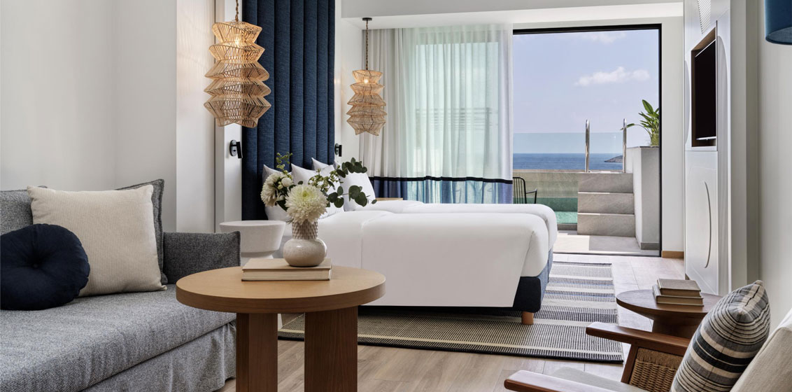 Each of the resort’s 199 guestrooms and suites evoke a sense of serenity and elegance through interiors that harmoniously blend crisp contemporary linens and soft furnishings with organic-inspired elements and traditional Cretan influences. Minimalist design marries sophisticated elegance in the Classic and Premium rooms, which boast private plunge pools, balconies, coffee-making facilities, walk-in showers, and luxury toiletries.