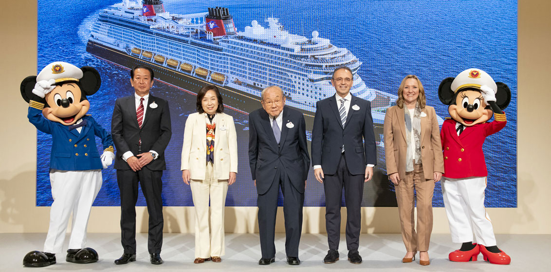 Lead image, from left: Kenji Yoshida, Representative Director, President and COO, Oriental Land Co.; Yumiko Takano, Representative Director, Chairperson and CEO, Oriental Land Co.; Toshio Kagami, Chair of the Board of Directors, Oriental Land Co.; Thomas Mazloum, President, Disney Signature Experiences; and Sharon Siskie, Senior Vice President, Disney Cruise Line are joined by Captain Mickey Mouse and Captain Minnie Mouse.