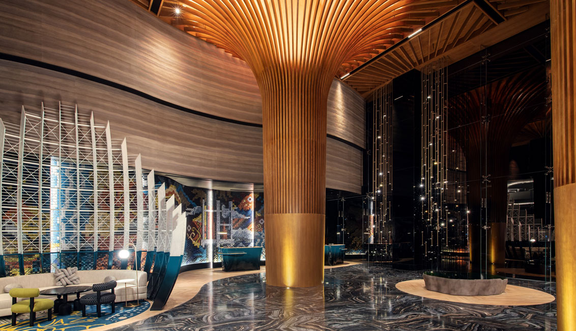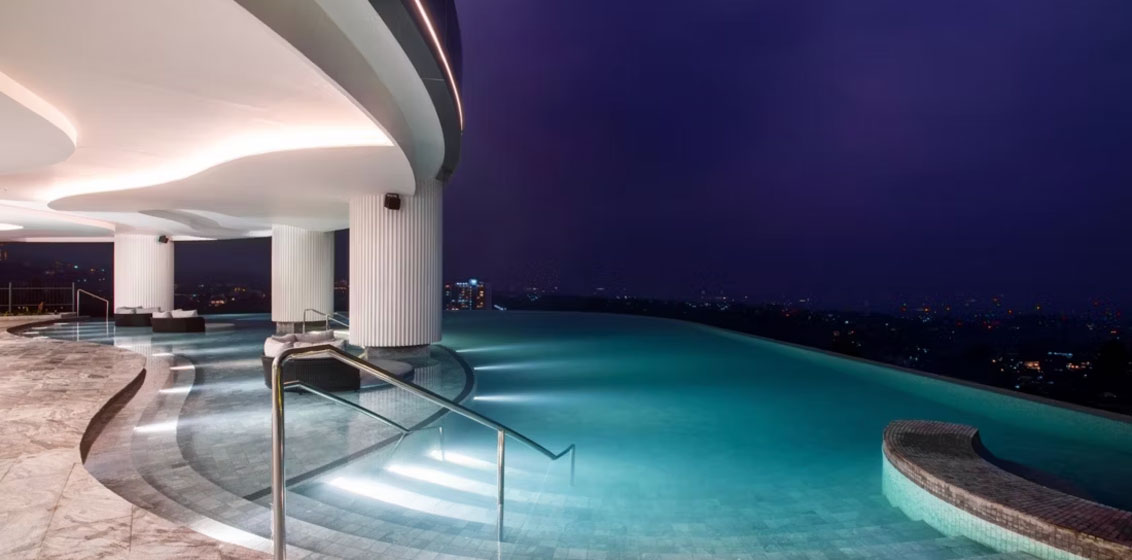 The hotel’s design integrates traditional Sundanese motifs and nature elements, such as cascading waterfalls, classic Bandung batiks, and folklore inspired by the nearby Tangkuban Perahu mountain. Its 277 rooms and suites blend local charm with contemporary comfort, and the lobby, encased in floor-to-ceiling windows, showcases the picturesque views of the surrounding vistas.
