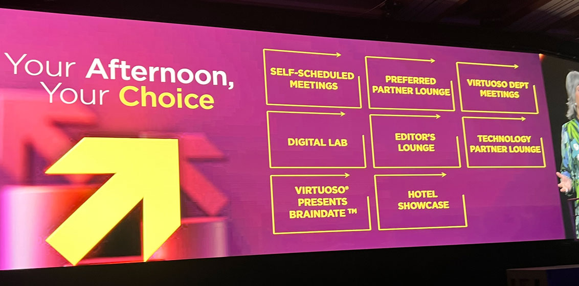“You asked for more control of your schedule so we’re empowering you to design your afternoons,” Jennifer Campbell, Virtuoso’s SVP Network Products & Events said at the Opening Session of Travel Week. “With that flexibility comes a bit more work on your part, so you have to put a bit more work into it,” she foreshadowed.