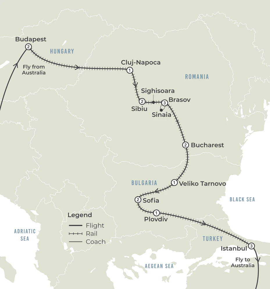 The trip commences with two nights in Budapest, Hungary and spends one or more nights in Cluj Napoca, Sinai, Brasov and Bucharest in Romania as well as Veliko Tarnovo, Sofia and Plovdiv in Bulgaria. The journey concludes with a three-night stay in Istanbul. Accommodation varies from city to city, with international brands including Marriott, Mercure & Ibis, Radisson Blu, MGallery and the five-star InterContinental and Kempinski.