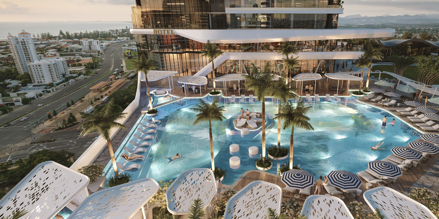 Overlooking Broadbeach, the expansive outdoor pool deck on level six will be a destination hotspot with a cocktail bar, a beach club with private cabanas and al fresco dining.