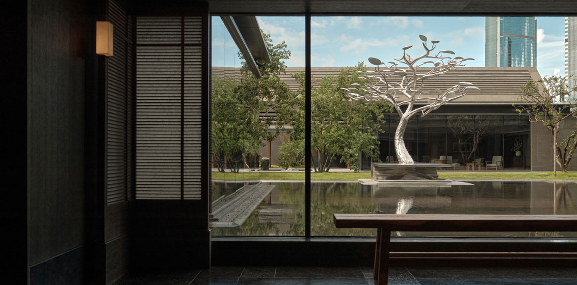 Upon arriving at the Lobby floor on Level 4, guests will be overtaken by a sense of calm as they emerge into a landscaped oasis inspired by Shanghai’s classical gardens. A series of open areas and walkways surround a small lake and a striking 5 metre-high ‘Gathering’ tree adorned with stainless steel and Jingdezhen ceramic leaves by local artist Oscar Wang serves as the focal point.