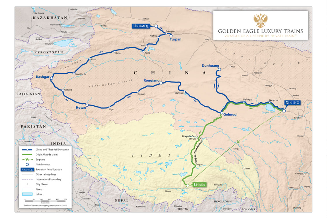 - China & Tibet Rail Discovery, a new 13-day journey between Urumqi and Lhasa, Nepal, taking in the fabled heights of Tibet aboard the Golden Eagle Silk Road Express, incorporating visits to Kashgar, Turpan, Dunhuang and Xining.