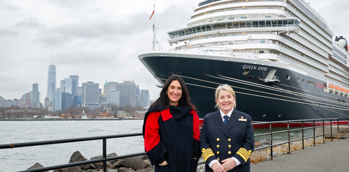Pictured in New York Harbour with Queen Anne are Cunard President Katie McAlister (left) and Captain Inger Thorhauge.