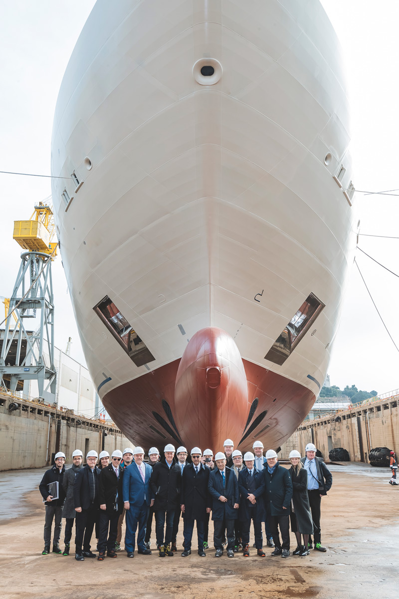 In keeping with maritime tradition, the float out ceremony recognises the shipbuilders’ work and accomplishments to date. Four Seasons I will now move to a wet dock for the final phase of construction, centred around the interiors, fixtures and fittings for suites, restaurants and public spaces.