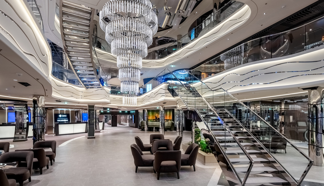 MSC World Asia features subtle design elements that reflect Asia’s rich culture, art, and beautiful landscapes. It retains the signature plumb bow rising vertically from the waterline and the iconic Y-shaped aft that opens onto the impressive outdoor promenade, hallmarks of MSC Cruises’ World Class ships.