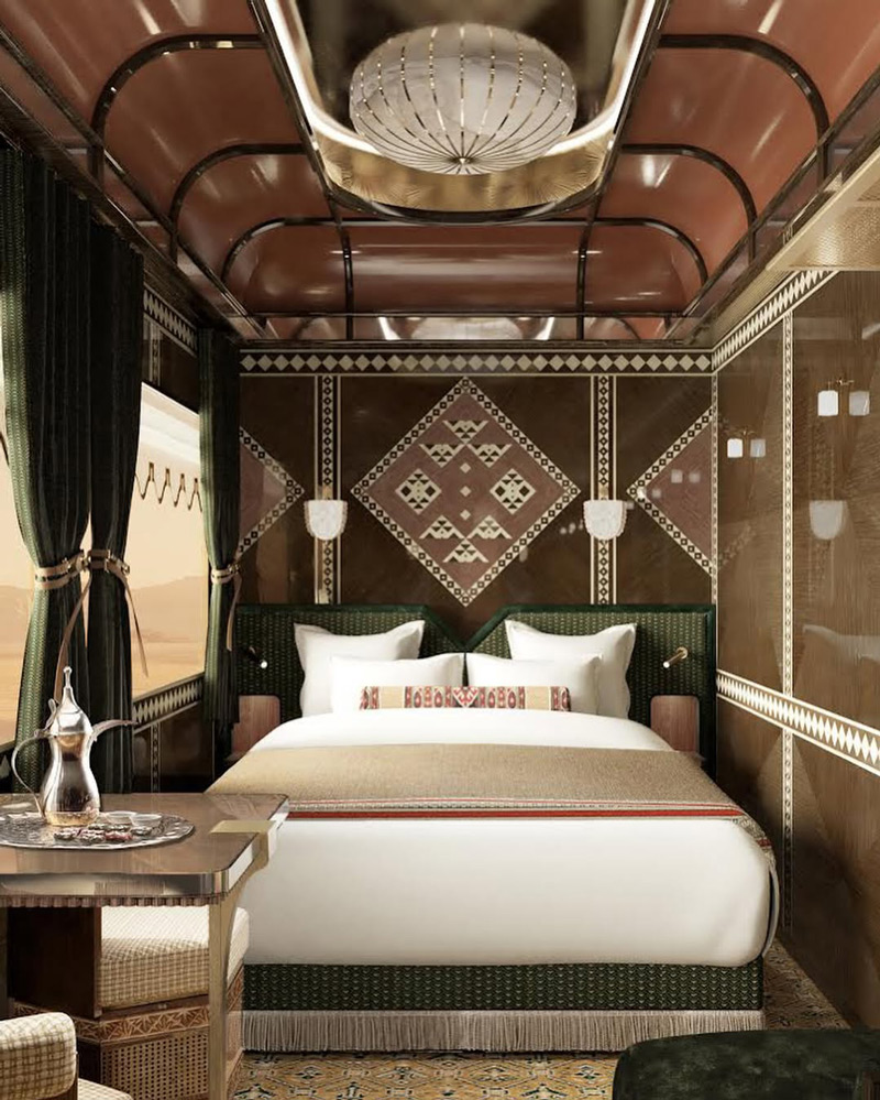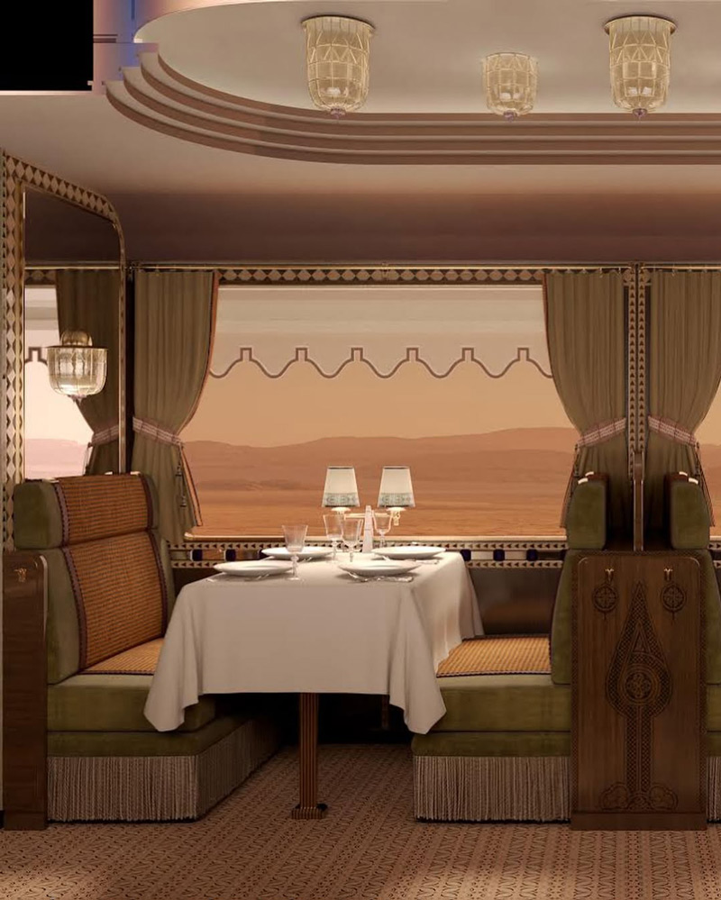 Dream of the Desert is designed by architect and interior designer Aline Asmar d’Amman and her studio Culture in Architecture, reflecting a fusion of modern elegance and Saudi heritage. Inspired by the desert landscape and traditional Saudi architecture, the interiors feature refined craftsmanship, with earthy tones, luxurious textiles, and intricate decorative details. Architectural elements and motifs from iconic Saudi landmarks—including Madain Saleh and Hail—are woven into the train’s design, offering passengers a journey that is both visually and culturally enriching.