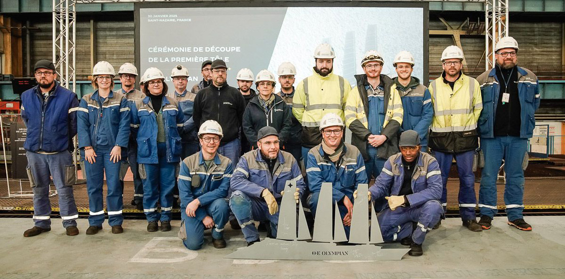 Maritime traditions continued the same day with the steel cutting ceremony for the second yacht in the Orient Express Sailing Yachts fleet, marking a symbolic launch of the industrial phase of Orient Express Olympian, sistership to Orient Express Corinthian. The steel cutting ceremony saw the very first of 80,000 pieces cut that will make up the yacht’s hull. This ceremony takes place at Chantiers de l’Atlantique’s steel cutting workshop.