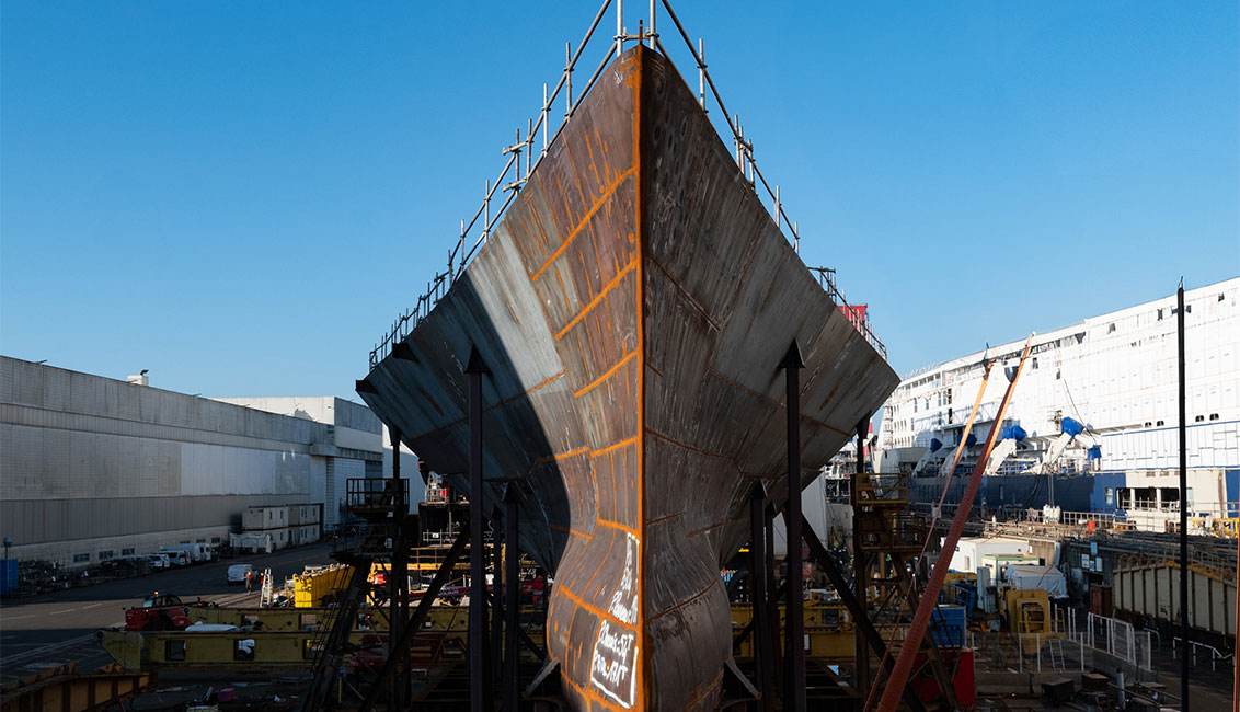 Over the next two months, 13 further steel hull blocks and three balestron blocks will be lifted and assembled by two large gantry cranes to form the ship’s metallic hull which will be launched in June. Once completed, the ship will be transferred to an outfitting dock for the ultimate phase of its construction until delivery.