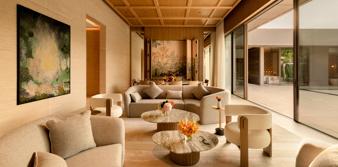 Raffles Sentosa Singapore features 62 villas, each with a private pool and outdoor terrace, ranging from a one-bedroom 211 square metre villa to the four-bedroom 650 square metre Royal Villa. Expansive floor-to-ceiling windows frame sweeping views of the verdant landscaping, while a harmonious blend of natural materials and intricate textures creates a seamless tie between indoor and outdoor spaces.