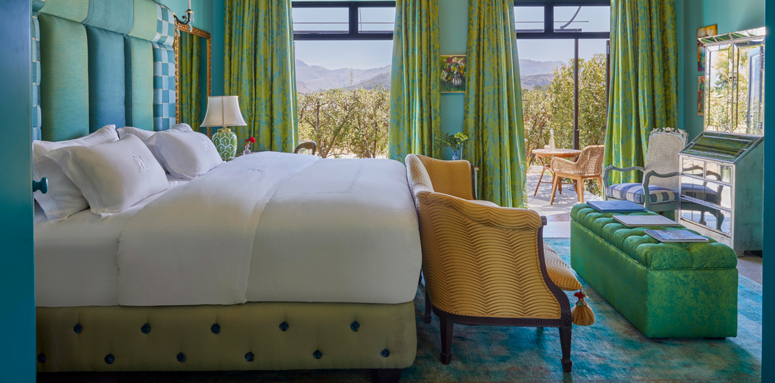An interactive kitchen invites guests to explore the rich culinary traditions of Franschhoek. With a private chef at the helm, the villa offers farm-to-table delights made with seasonal, organic ingredients sourced from La Residence’s own kitchen garden. Guests can also enjoy alfresco dining and entertainment in the outdoor area, featuring an inviting pool, pizza oven, and a variety of patios.Franschhoek House is the embodiment of both artistry and inspiration. Spaces draw on the elegance of vintage French aesthetics and blend them with the vibrant colours and textures of African and Indian cultures. Each bedroom suite has been designed to tell its own story, featuring bold colour schemes, Indian silks, local tapestries and vintage treasures. Contemporary African artworks by artists such as Tafadzwa Tega, Franklyn Dzinga and Kate Gottgens adorn walls in shades of orange and yellow.