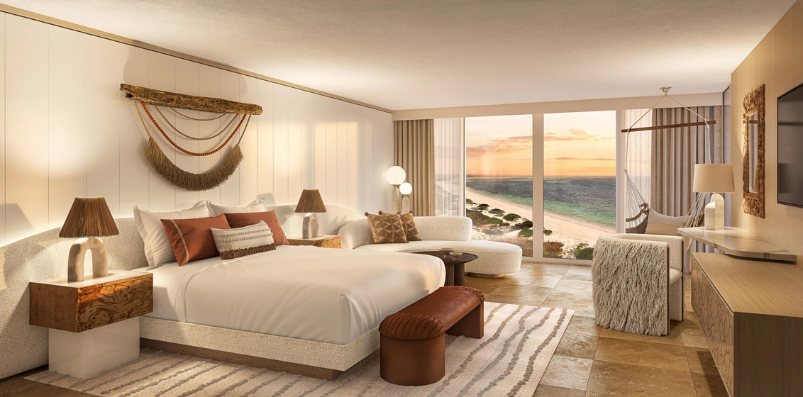 The resort boasts 100 guest rooms and suites crafted with regionally sourced materials, such as native wood, coral stone, and sisal, to create a sense of tranquility while enhancing the connection to the natural surroundings via floor-to-ceiling windows and expansive balconies.