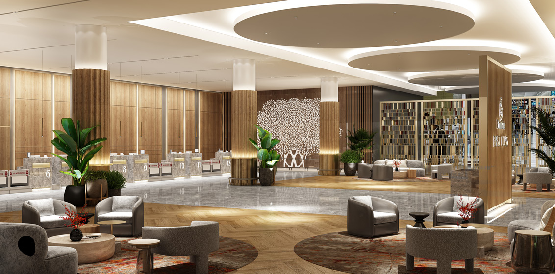 Lead image: Emirates’ new First Class Check In Area in Terminal 3, Dubai International. Render of the planned upgrade to Emirates’ First Class Check in Area.