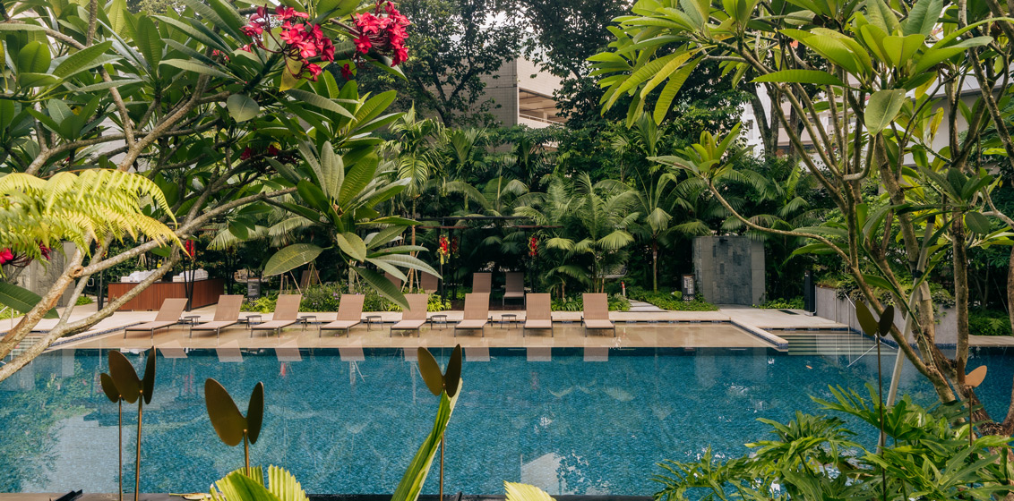 Strickland also reimagined the hotel’s reception and public spaces, where a sculptural centrepiece and carved louvers echo Peranakan motifs, and ceiling fins made of local wood wrap the Grand Lobby with a sense of warmth.