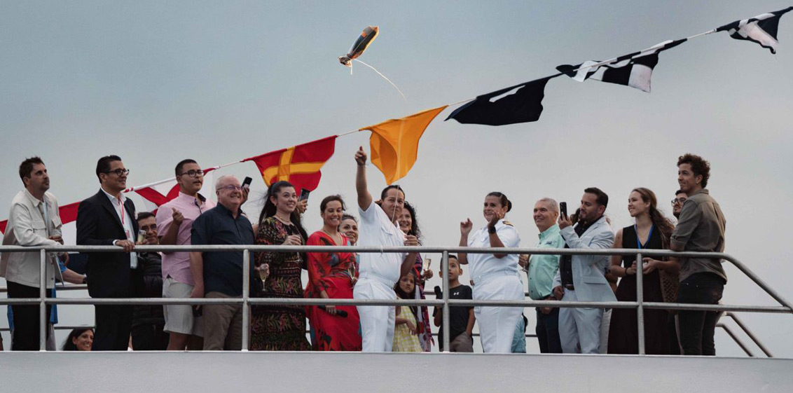 Lead image: Doctor Jaime Chavez; Miguel Bermeo, Electrician; Victor Acurio, Chief Engineer; Jose Vergara, Third Officer; Nathaly Alban, Captain of National Geographic Gemini; Julian Puente, Second Officer; Pablo Peña, Eduardo, Technical Superintendent; Ana Esteves, Senior Vice President of Hotel Operations; Natalya Leahy, Lindblad Expeditions CEO; Jhon Iturralde, Captain of National Geographic Delfina; and Victor Cruz, Second Engineer on the bow of National Geographic Gemini just moments before the bottle breaking ceremony.