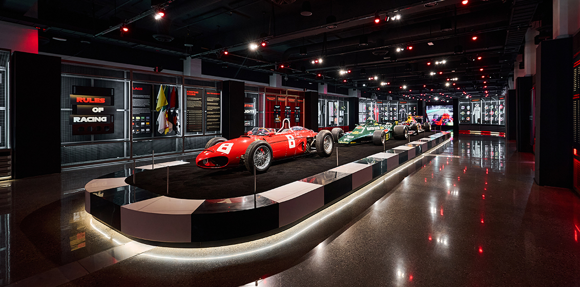 In the museum-like “75 Years of F1,” three historic cars are on display: a 1961 Ferrari, a 1979 Lotus and a 2011 Red Bull. In addition, helmets and trophies from throughout the years, modern-day racing suits, and live-size digital displays of top racers, plus more, are on display.
