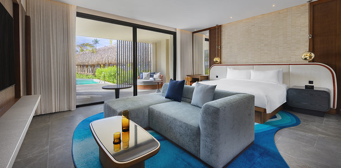 As far as public spaces, the resort has a 400-metre beachfront paired with the brand’s signature WET Deck, an 80-metre infinity pool. Alternatively, the Chill Pool offers a serene ambiance with a swim-up bar serving spritzers and healthy bites. The pools are surrounded by plenty of sunbeds, too.