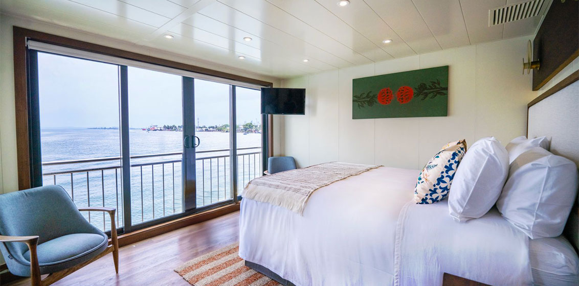 “It’s small, it’s intimate, but it’s very similar to our European vessels,” Karst says, noting signature twin balcony staterooms on the vessel are complemented by four suites and a rooftop swimming pool.
