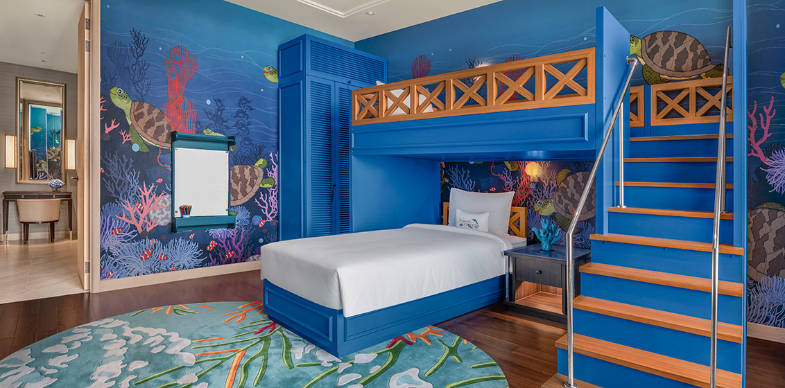 Nearby, the Sealife Family Suites extend the sea-themed journey with a vibrant, whimsical design that caters to both play and rest. Located on floor 10 alongside the Kids Club, each suite is hosted by Loma the Dolphin, Tuli the Turtle, or Silo the Seal, and brings the magic of the ocean indoors with imaginative décor and playful touches throughout.