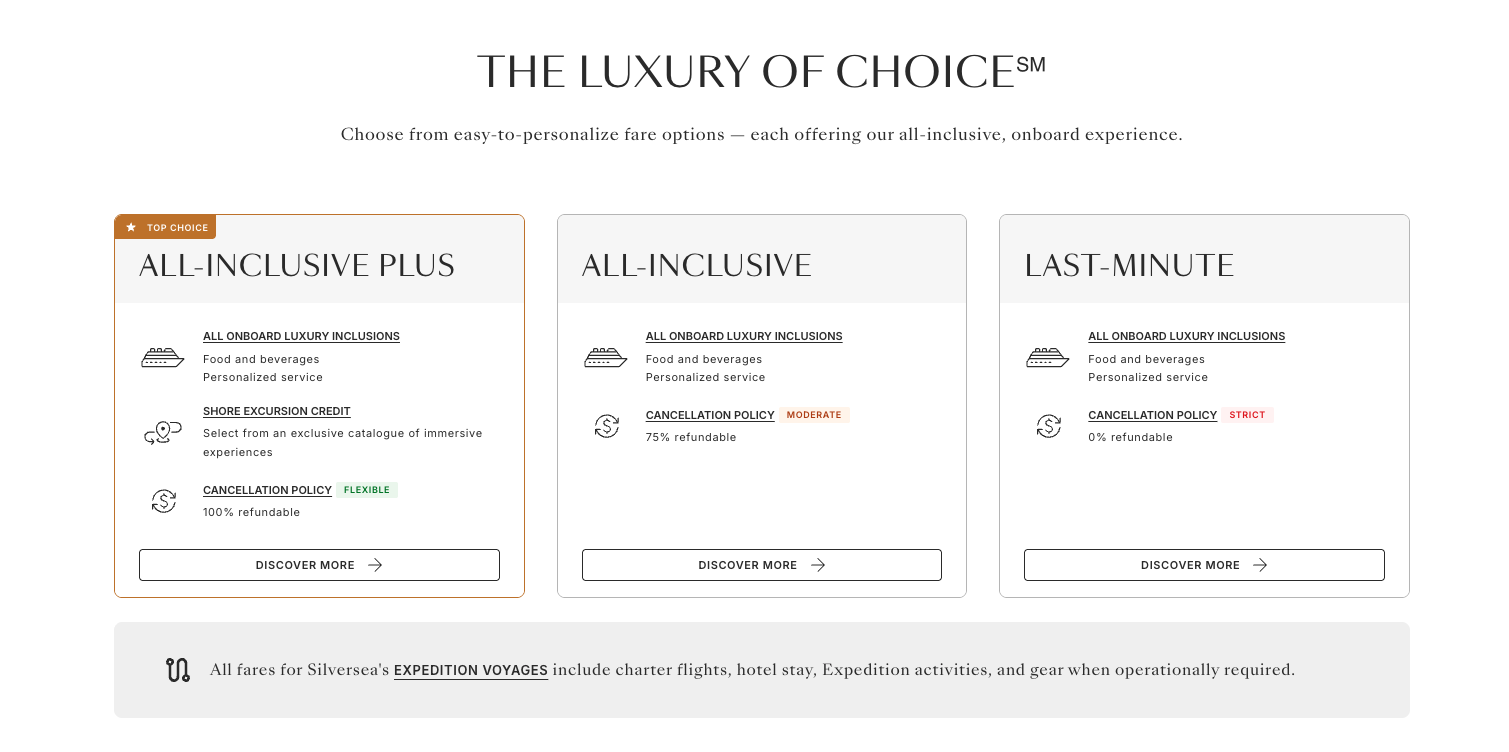 Silversea’s three new fares – billed as “The Luxury of Choice” – are comprised of: