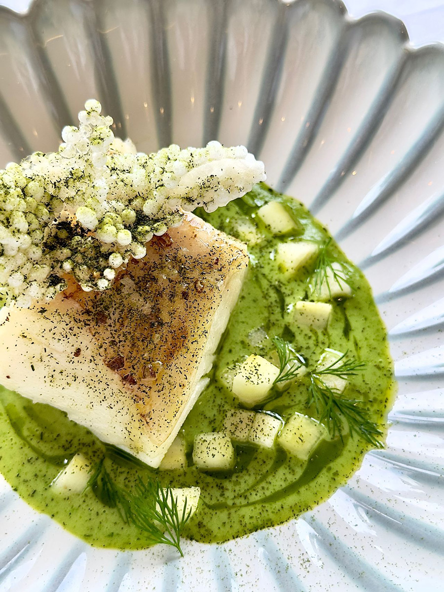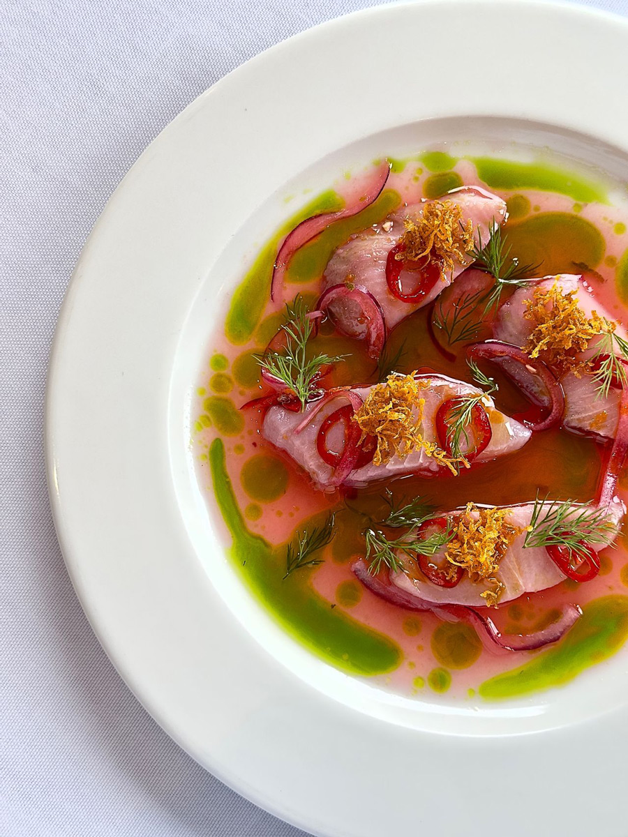• Raw Hamachi – aqua de chile espuma, soybean-parsley & dill salad, herb oil