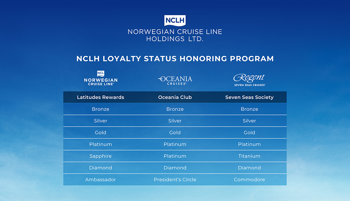Norwegian Cruise Line Holdings Ltd. (NCLH), the cruise company operating Norwegian Cruise Line®, Oceania Cruises® and Regent Seven Seas Cruises®, has effective immediately, launched its new Loyalty Status Honoring Program, enabling guests to have their loyalty status honoured across all three cruise brands.