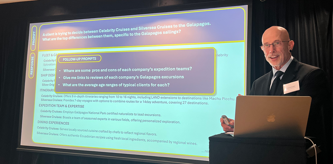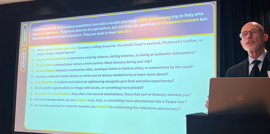 He said use AI to learn about talking points such as dining options for vegetarians in the destination, and if the client has family roots to the destination, find out anything special that may link them.
