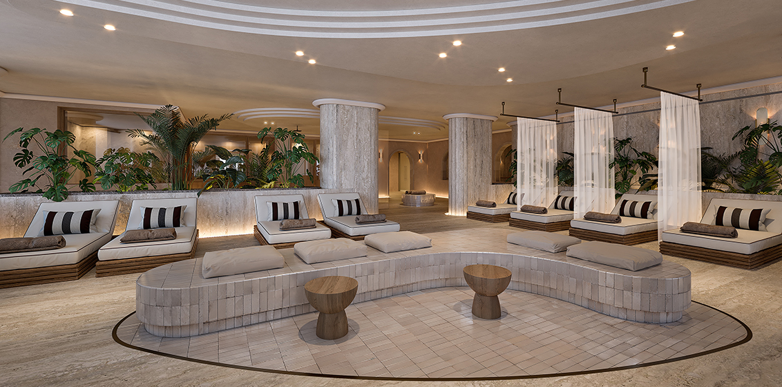 The spacious guest rooms, with the majority featuring heated private pools, hot tubs or direct access to the Aqua Piazza, all have a bold design grounded with a palette of terracotta, stone, and layered greens along with statement lighting. The resort will also offer a four-bedroom, 280 square metre villa which will feature a private outdoor terrace.