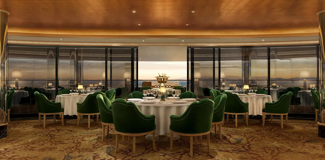 Sedna, the Yacht’s centerpiece dining destination (pictured below), will welcome a roster of celebrated culinary voices whose tasting menus will run alongside the restaurant’s signature offerings. Visiting chefs will bring their distinct “artistry” and regional perspectives to Sedna’s kitchen, turning the venue “into a continuously evolving expression of global cuisine.”