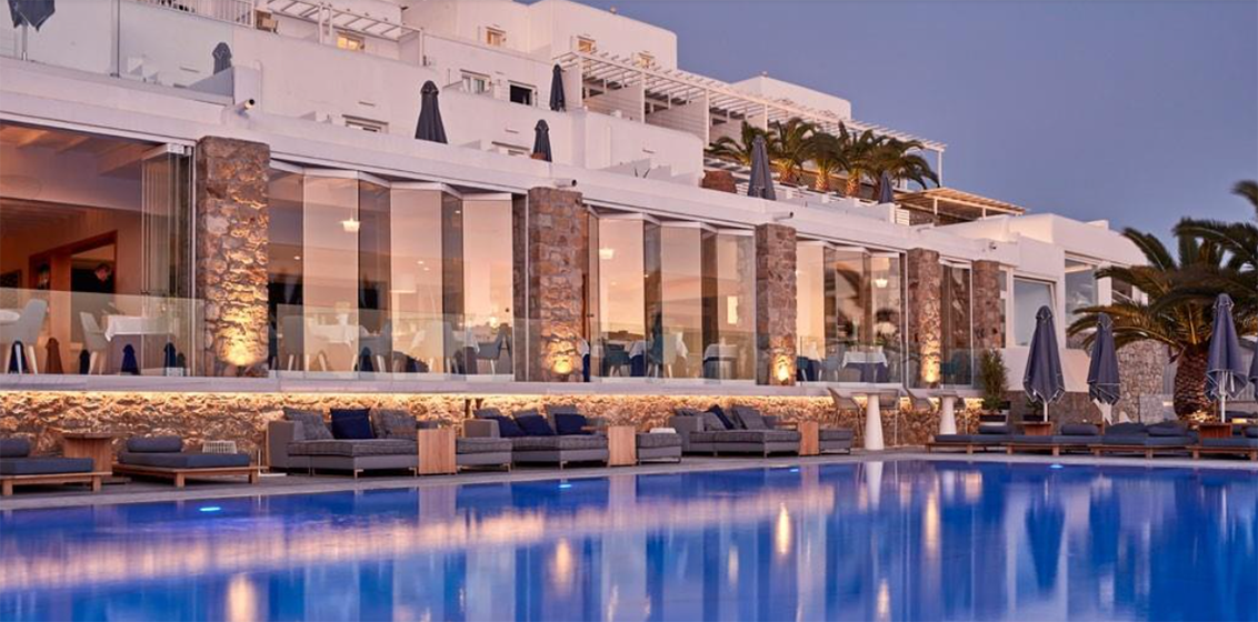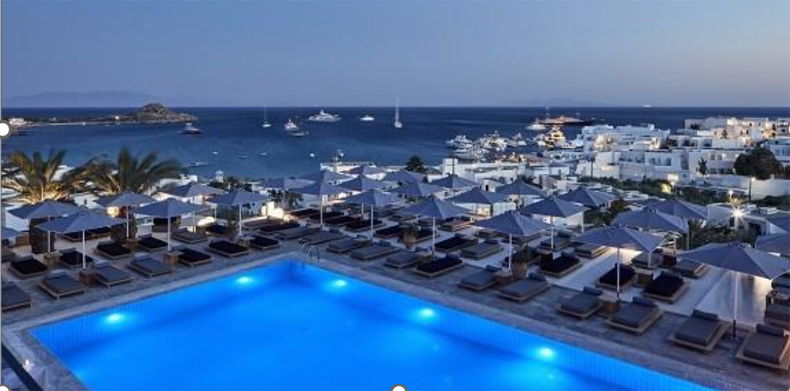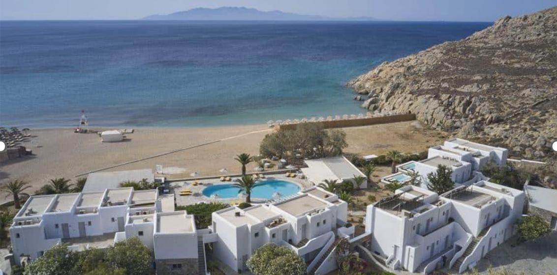 Nestled above the bay of Platis Gialos, this luxe resort blends hillside calm with proximity to Mykonos’ most celebrated beaches (Psarou, Paranga, Agia Anna) and only a 15-minute drive to Mykonos Town.
