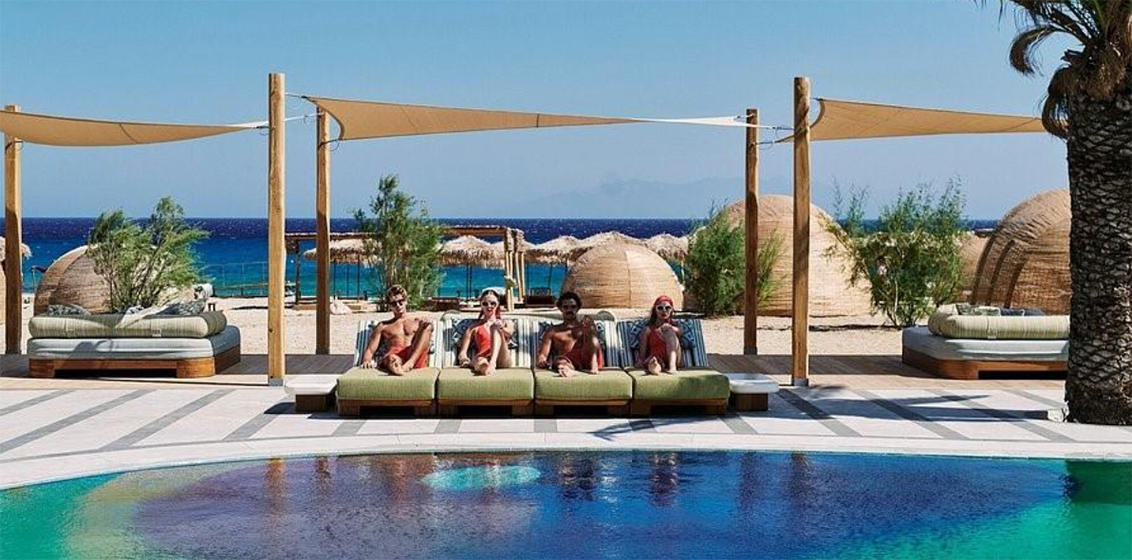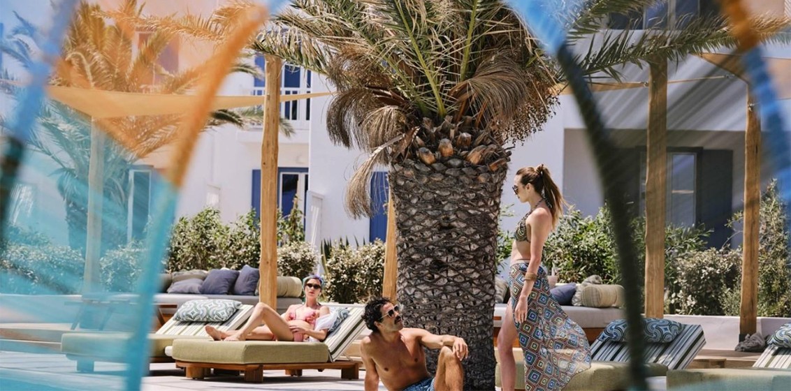 From the charming pool deck to the beach club and taverna under the trees, Sunshine Mykonos invites a slower rhythm — ideal for couples or those who want to unwind away from the main bustle. (Myconian Sunrise)