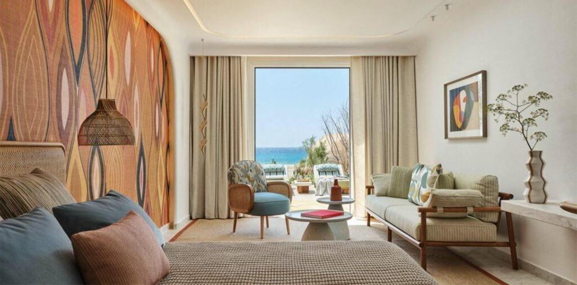 Rooms and suites emphasise space, comfort and sweeping sea views — think marble features, private terraces, modern textures.