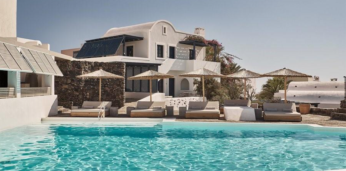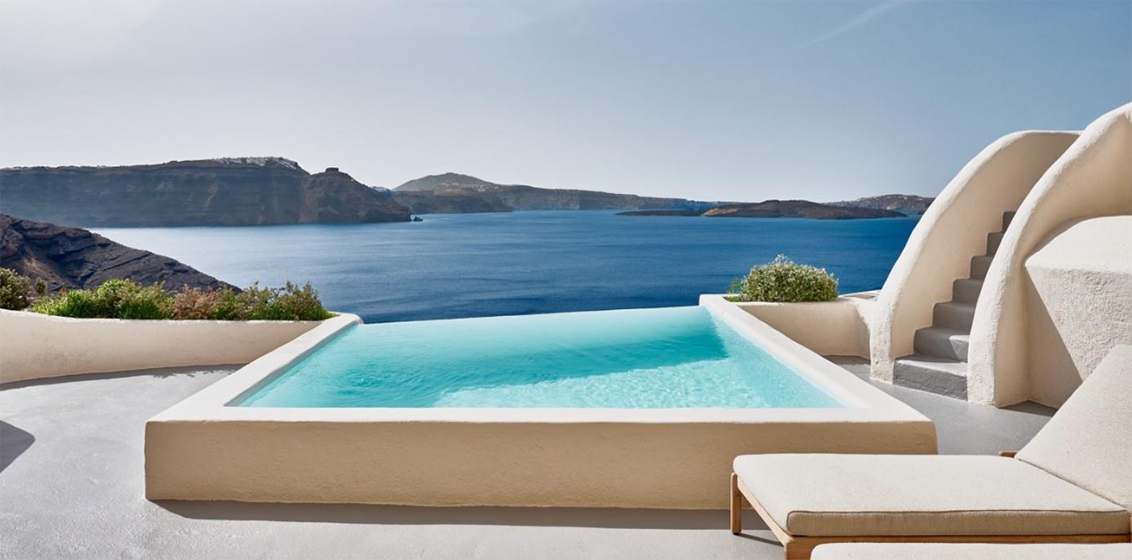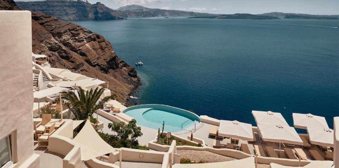 In contrast, Mystique sits dramatically on the caldera cliffs in Oia — perhaps the most iconic vantage point on Santorini. (Marriott)