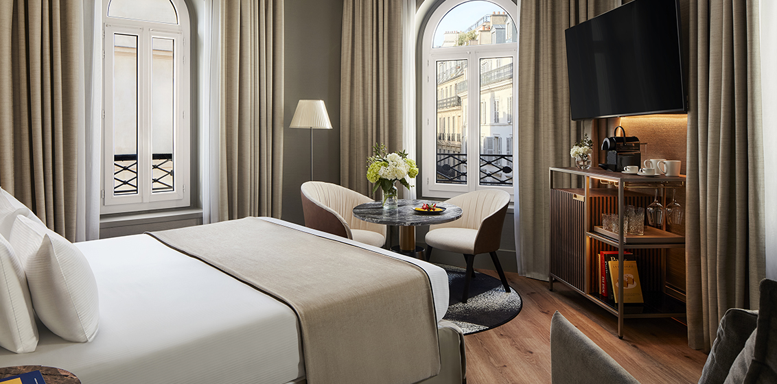 The rooms and suites blend “the classic charm of Parisian architecture” with modern design. As a tribute to the fashion houses that shaped Paris, rooms feature a collection of black-and-white photographs celebrating style icons of the 1950s and 1960s. Guests can choose among several room categories—Deluxe, Premium and Junior Suites.