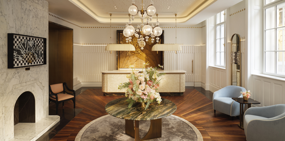At the heart of the hotel lies a beautifully restored courtyard, with arrival spaces showcasing sculptural chandeliers and the original grand staircase.