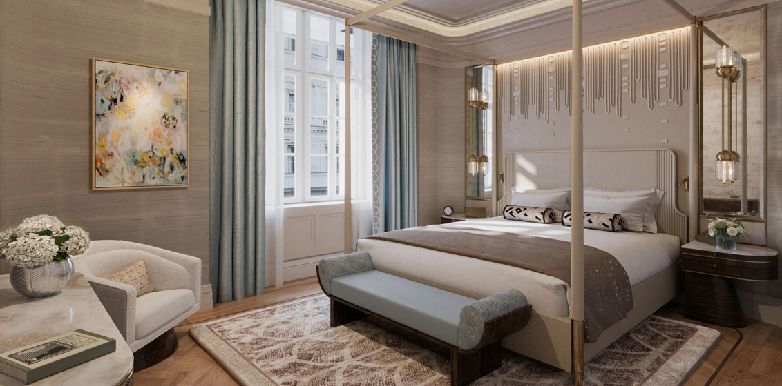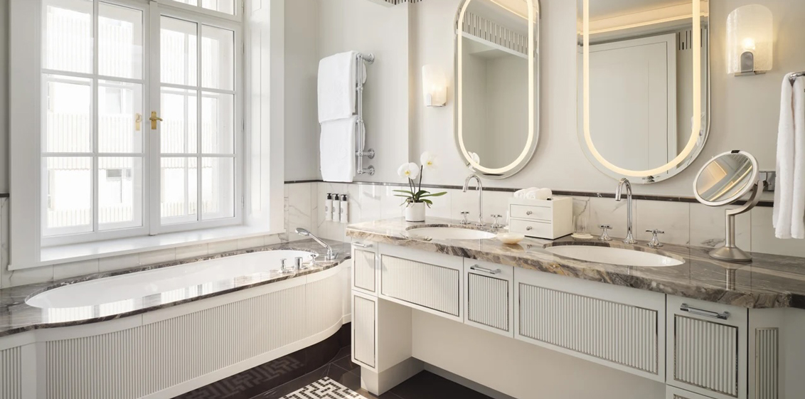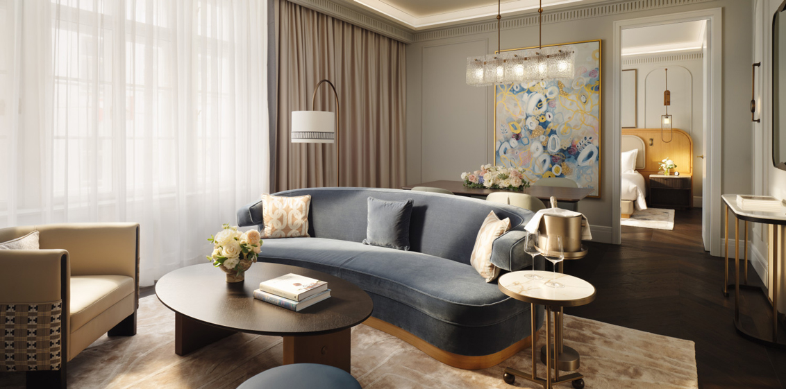 Spanning four floors, the hotel’s 86 rooms and 52 suites have been conceived as serene sanctuaries, bathed in natural light and crafted with bespoke furnishings and soft neutral palettes. Each space evokes the charm of Vienna while exuding understated elegance and calm, Secessionist-inspired fabrics and thoughtfully designed bathrooms.