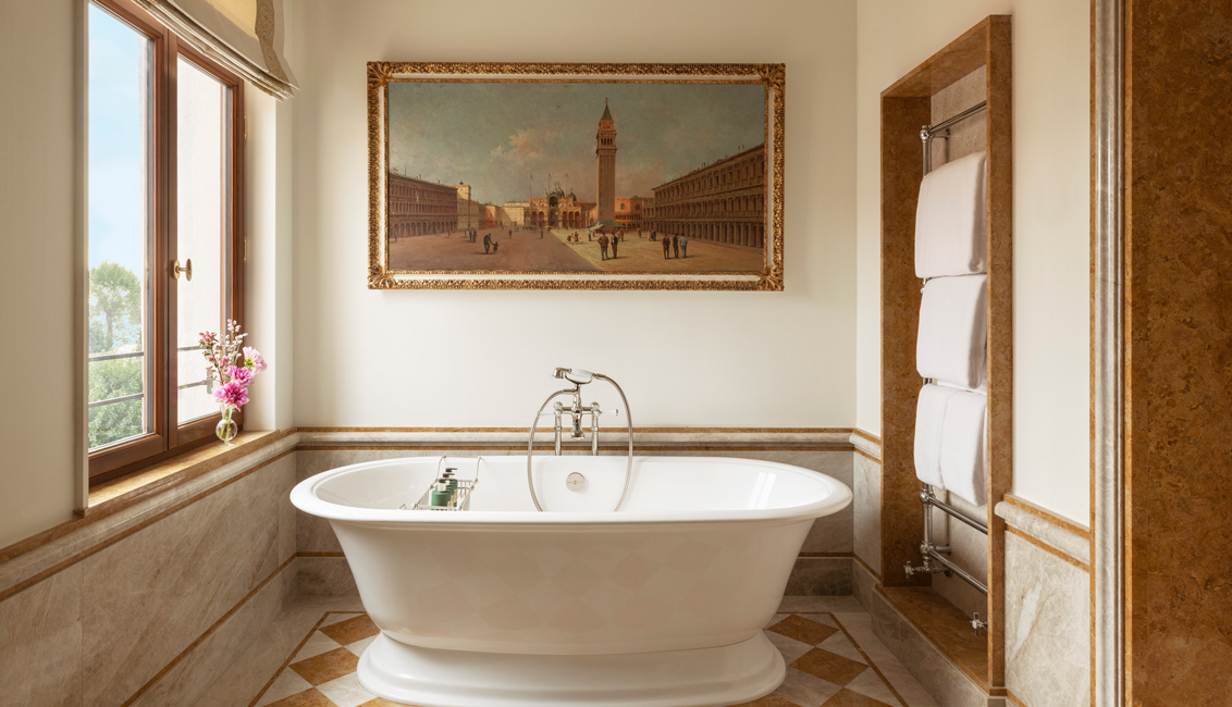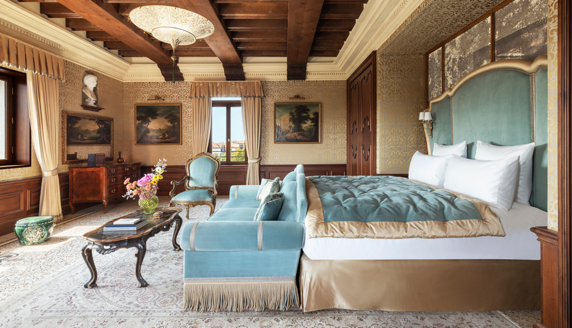 The Airelles features 45 keys including 17 rooms and 28 suites, plus a private villa with three bedrooms, a pool, and a private garden. The 450-square-metre presidential suite with four bedrooms embodies this spirit at its highest level, offering incredible views over Venice’s iconic landmarks.