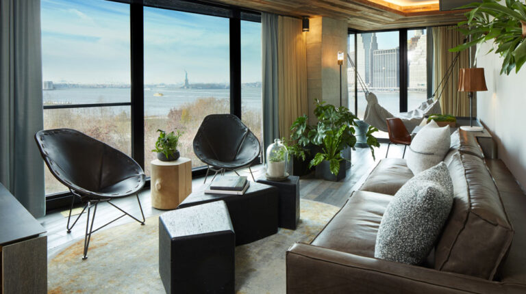 New York’s 1 Hotel Brooklyn Bridge has so many touchpoints I keep on thinking, in retrospect, of yet more things. Opened in February 2017, it is adjacent to Brooklyn Bridge Park, a conversion, thanks to then-Mayor of New York Michael Bloomberg, from old warehouses. It is an 11-floor structure, a glass and metal new-build by Marvel Architects, with interiors by INC Architecture.
