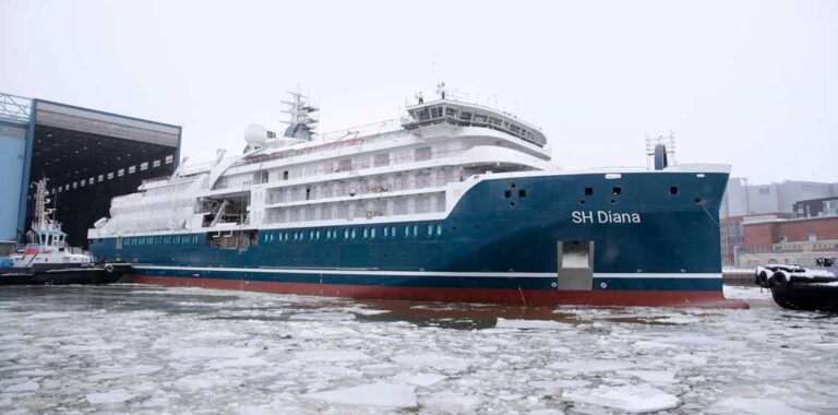 Swan Hellenic’s second ship, SH Vega, was floated out of dry dock at the Helsinki Shipyard late last week. SH Vega is the “twin-ship” of SH Minerva, launched at the end of 2021 and now exploring Antarctica.