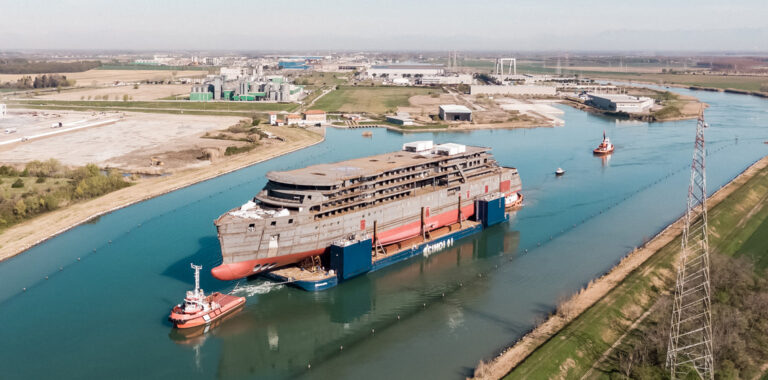 Hull of new expedition ship moves from San Giorgio di Nogaro to Genoa, Italy