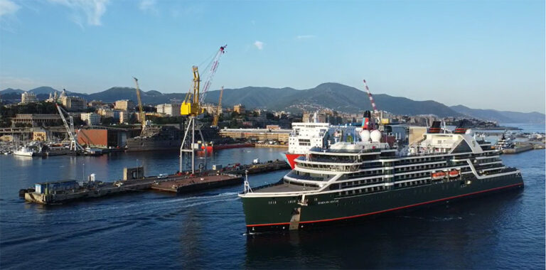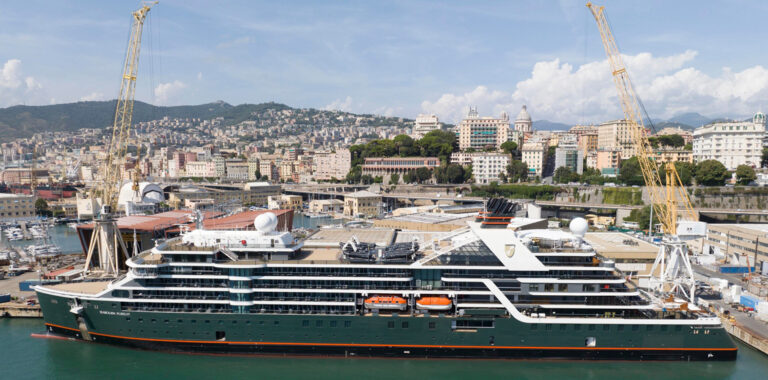 The hull of Seabourn’s first purpose-built expedition ship has arrived at the T. Mariotti shipyard in Genoa, Italy for the vessel’s final fit-out.