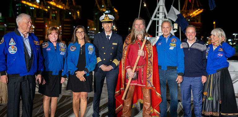 Viking named its newest ocean ship, Viking Neptune, with a celebration on Sunday in San Pedro, Los Angeles. As part of the event, the ship’s ceremonial godmother, Nicole Stott, retired NASA astronaut, aquanaut and artist, offered a blessing of good fortune and safe sailing for the ship – a maritime tradition that dates back thousands of years.