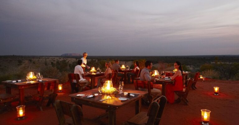 The open-air gastronomic experience offers a magical evening of fine dining on a remote sand dune overlooking Uluru.